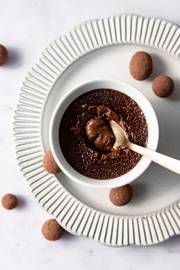 - Pour the heated cream over the chocolate dotties and leave to sit uncovered for about 5 minutes to allow the chocolate to melt. Add the pinch of salt and whisk to combine, set aside.