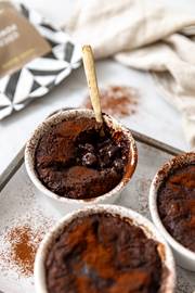 - Evenly distribute the mixture over the top of the puddings and tap/shake the dishes gently to spread it out.