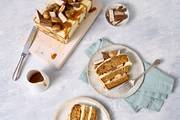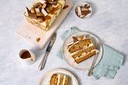 8. Repeat steps with remaining two layers of cake. Use remaining buttercream to frost sides and top of cake. Garnish with Koko Black Maple Caramel Marbles, Koko Black Honey Almond Nougat and caramel sauce.