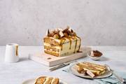 7. To assemble, slice banana loaf lengthways into three even pieces. Spread a thin layer of buttercream on the first layer of the cake. Using a piping bag fitted with a round tip, pipe a border of buttercream around the edges. Sprinkle one third of the crushed biscuits, sliced banana and melted Koko Black Salted Caramel Surprise inside the border.