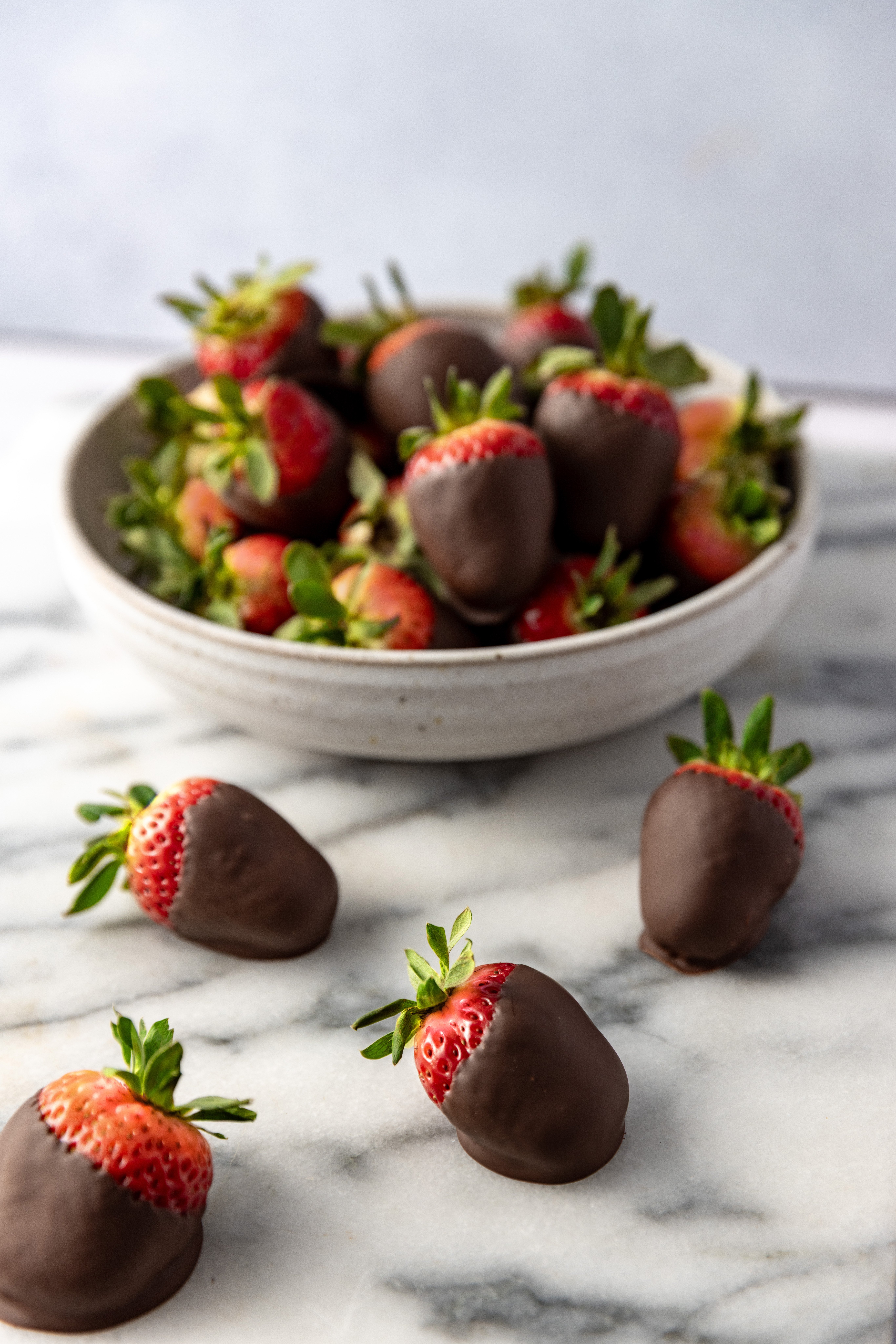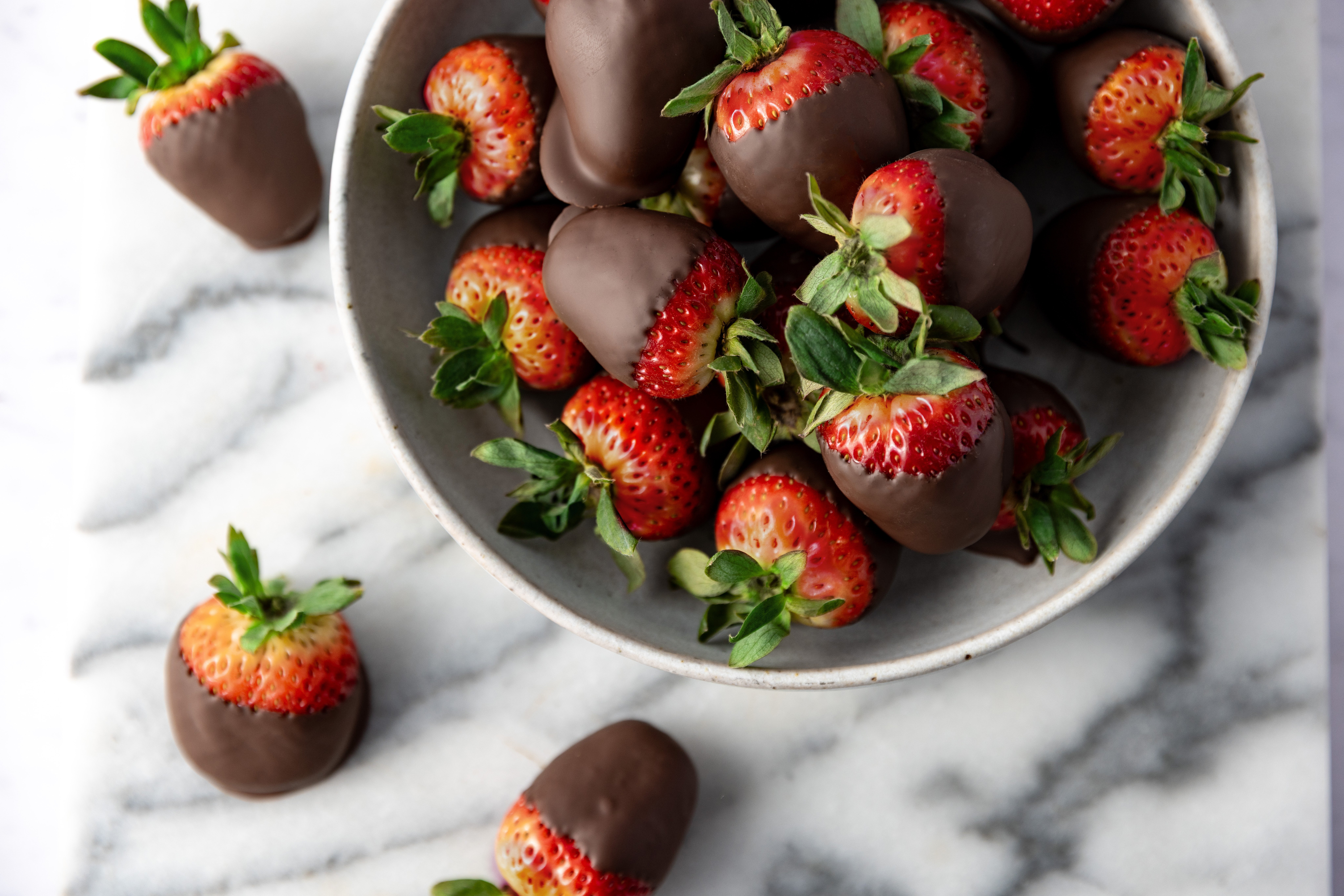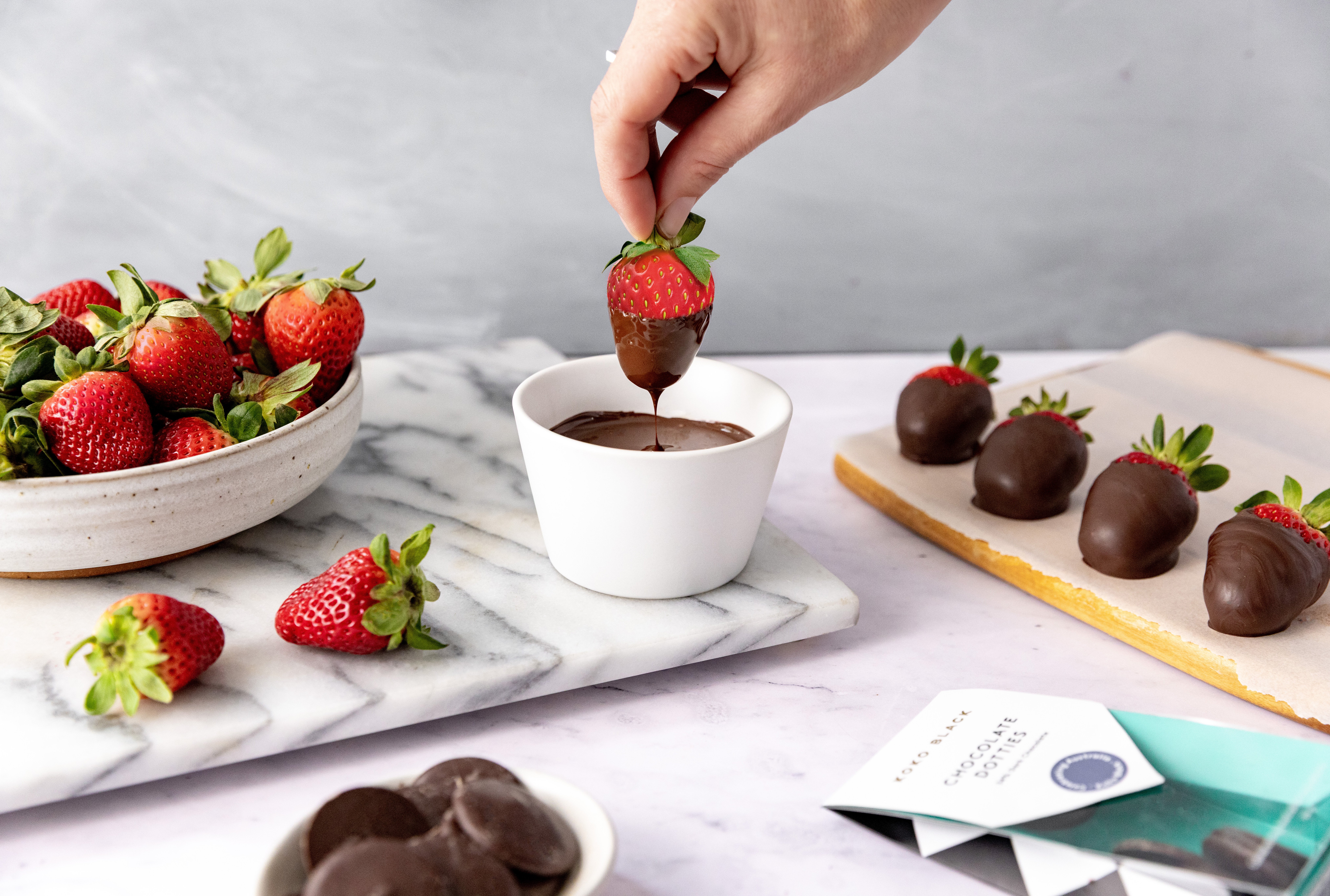 Wash and dry the strawberries thoroughly, leaving stalks and leaves intact. Spread out the strawberries on a clean tea towel and leave to air dry at room temperature for an hour or so. Ensure the strawberries are completely dry before coating with chocolate as water can cause the chocolate to seize.