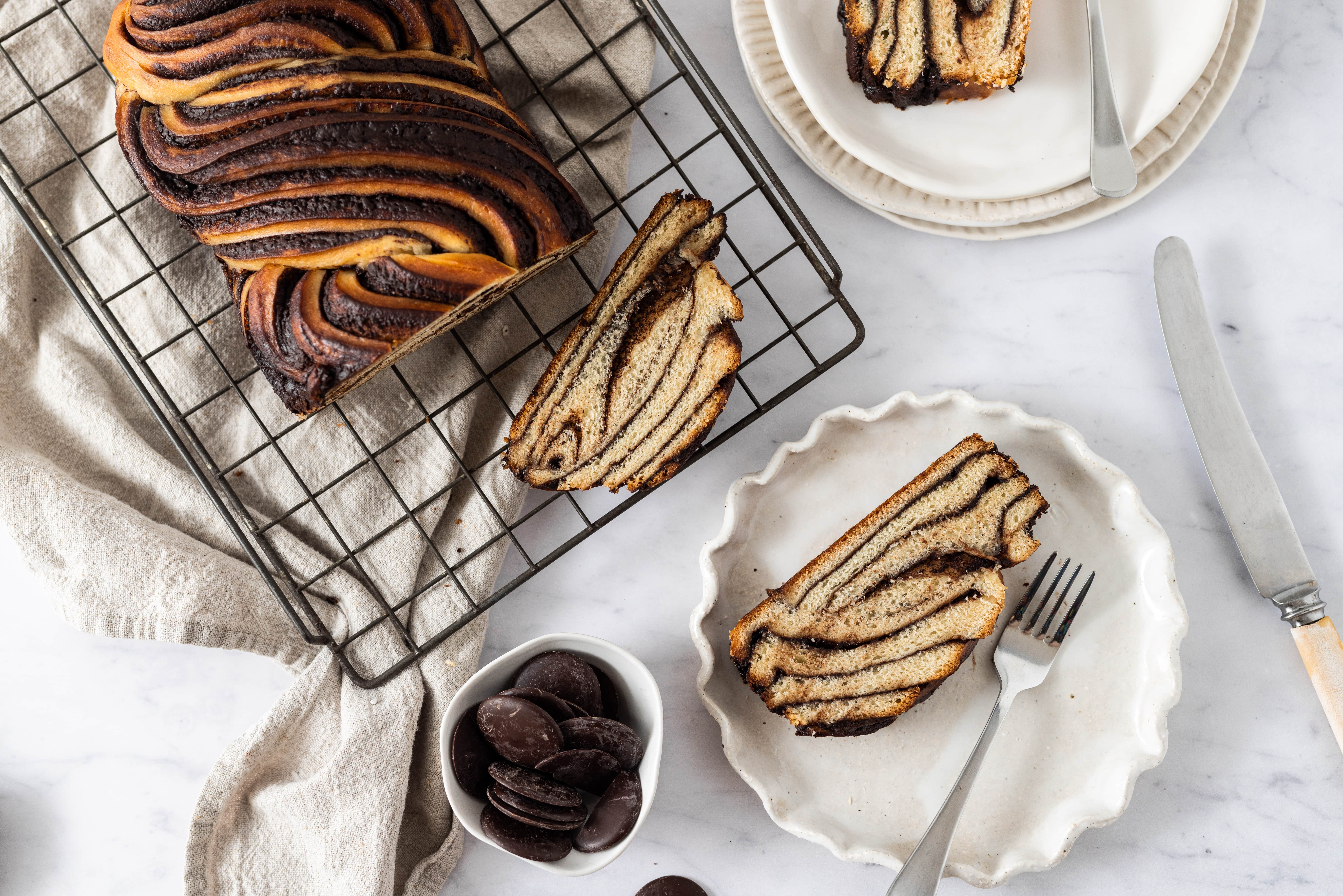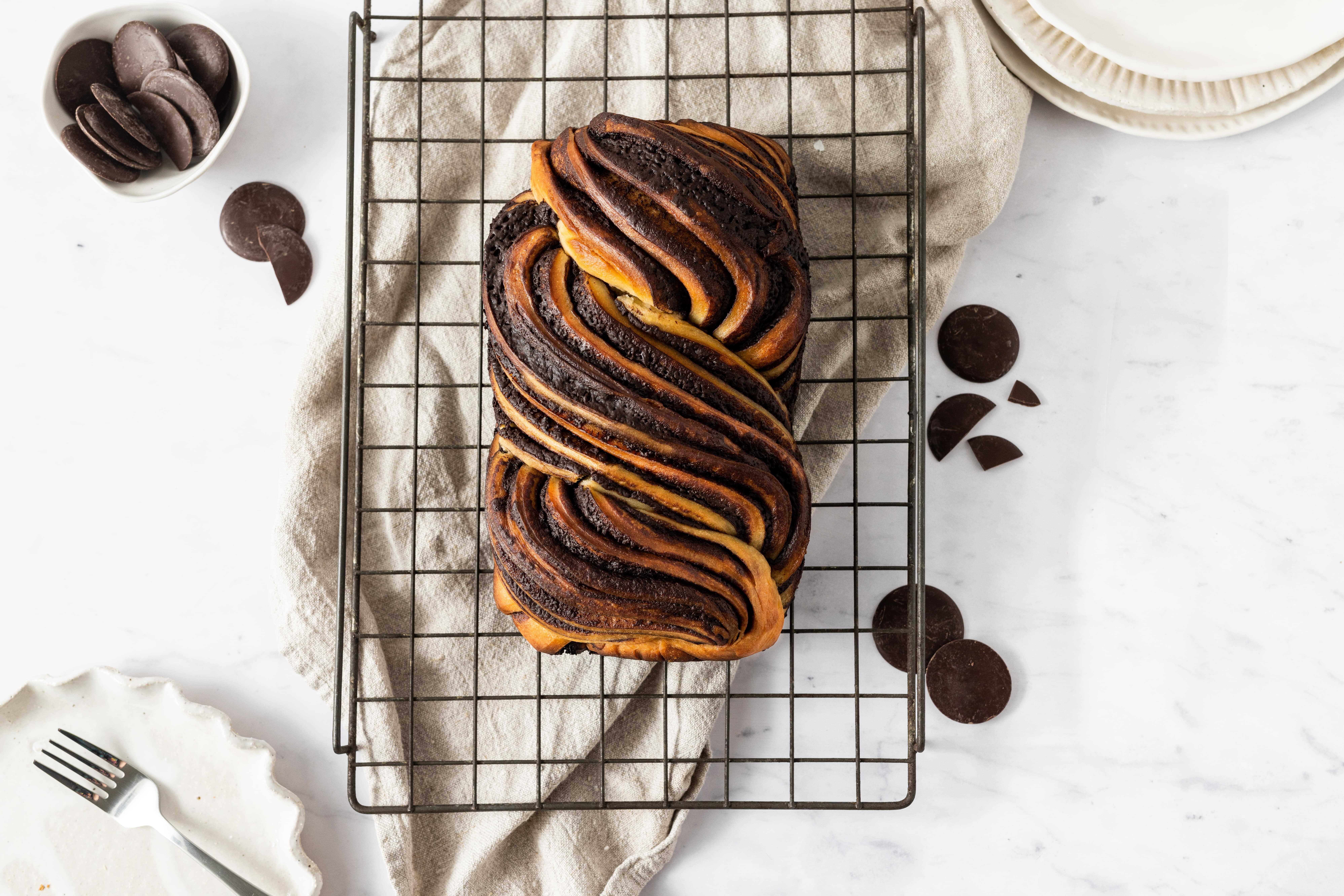 Grease and line two loaf tins, around 15cm x 25cm in size. Cut dough in half and return half to the refrigerator while you assemble the first loaf. Roll dough on a lightly floured surface until it reaches approximately 25cm wide, roll in the other direction until it is approximately 35cm to 40cm long. Spread with half of the chocolate mixture, leaving a 2cm boarder at the top edge. Starting at the shorter edge, tightly roll the dough in to a log, seal the end with a little water if need be and place seam side down in the freezer for 10 minutes while you assemble the second log in the same way as the first.