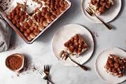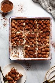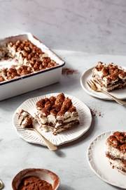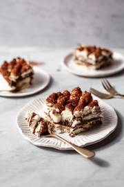 To assemble the tiramisu, dip half of the ladyfingers quickly on both sides into the cooled hot cocoa. Place in a layer on the bottom of a 23cm square serving dish or cake tin. Spoon about a third of the mascarpone cream mixture on top and gently spread over the ladyfingers. Carefully pour over the chocolate ganache to cover the mascarpone layer as evenly as possible. Repeat with a layer of the remaining ladyfingers, quickly dipping in the cooled hot cocoa as you go. Pipe the remaining mascarpone cream on top. Top with a generous dusting of cocoa powder. Refrigerate for at least four hours to set, preferably overnight. Slice into squares to serve.