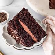 - Once the cakes are completely cooled it is time to make the dark chocolate ganache filling. Place a small glass or stainless steel bowl atop a saucepan of water. Bring the saucepan of water to a medium heat and add in half of the dark chocolate. Stir frequently until the chocolate is melted. Pour half of the cream into the melted dark chocolate and whisk until smooth and glossy. Turn heat off and, using a tea towel, remove bowl from the saucepan. Place the ganache into the fridge for 30 minutes.