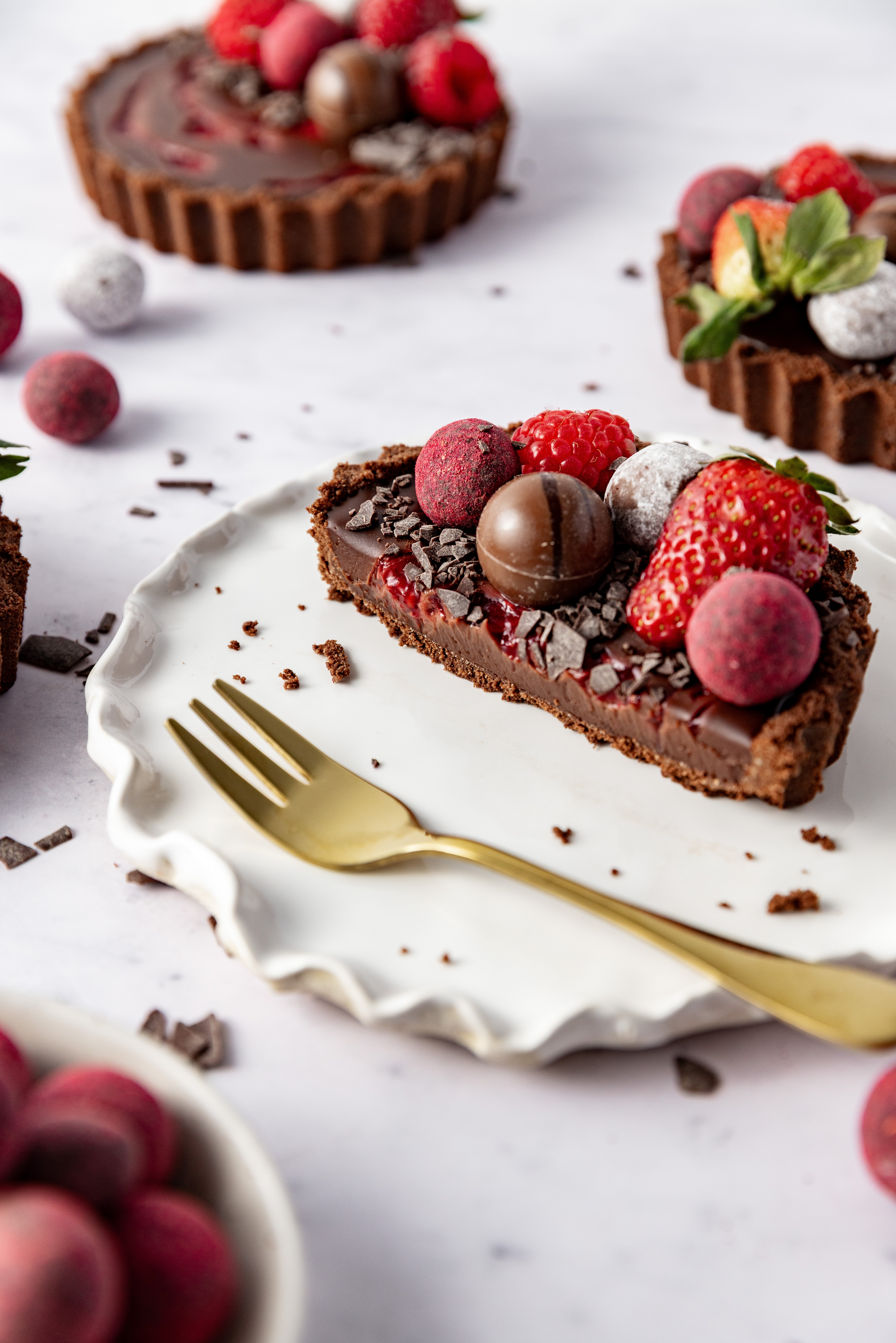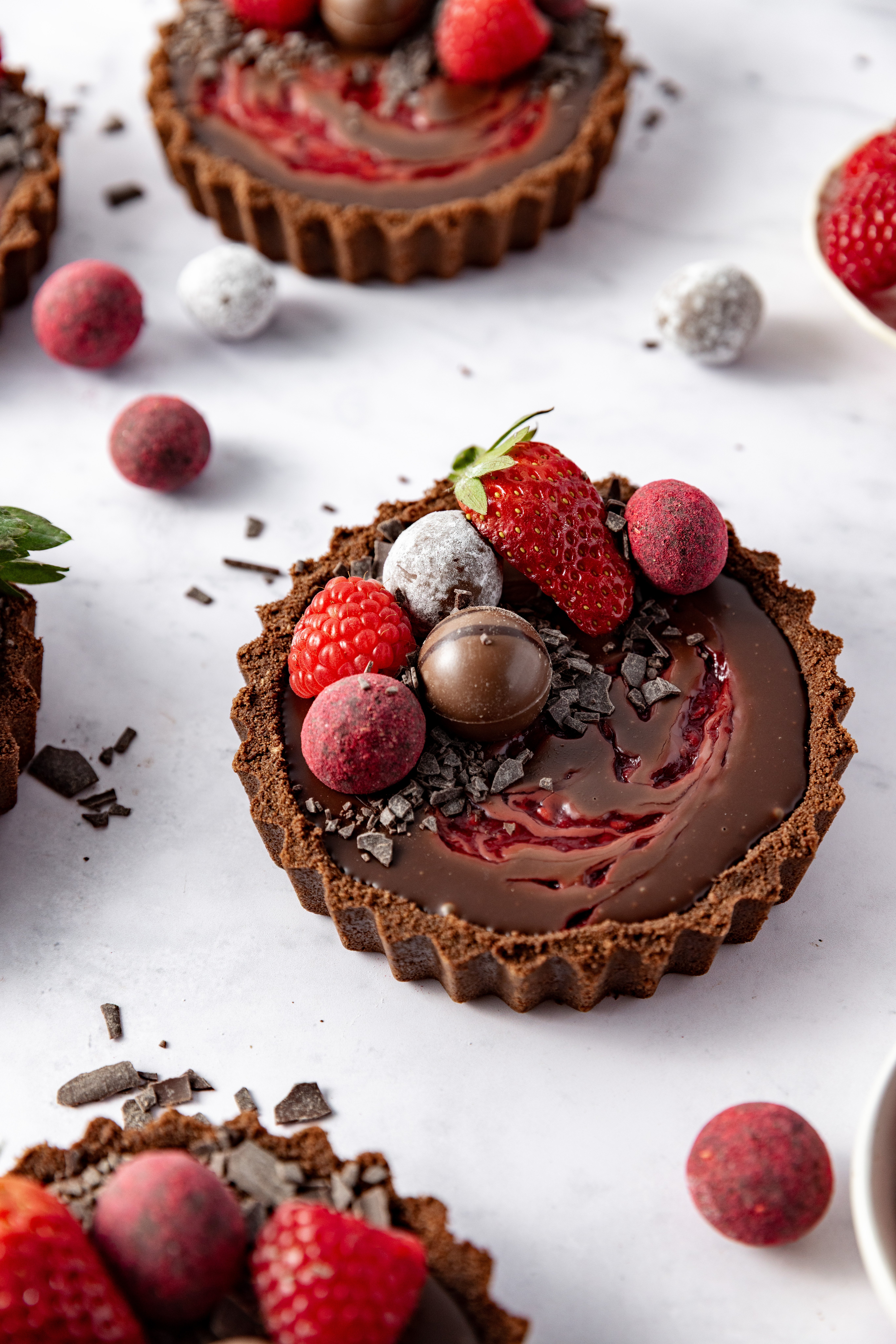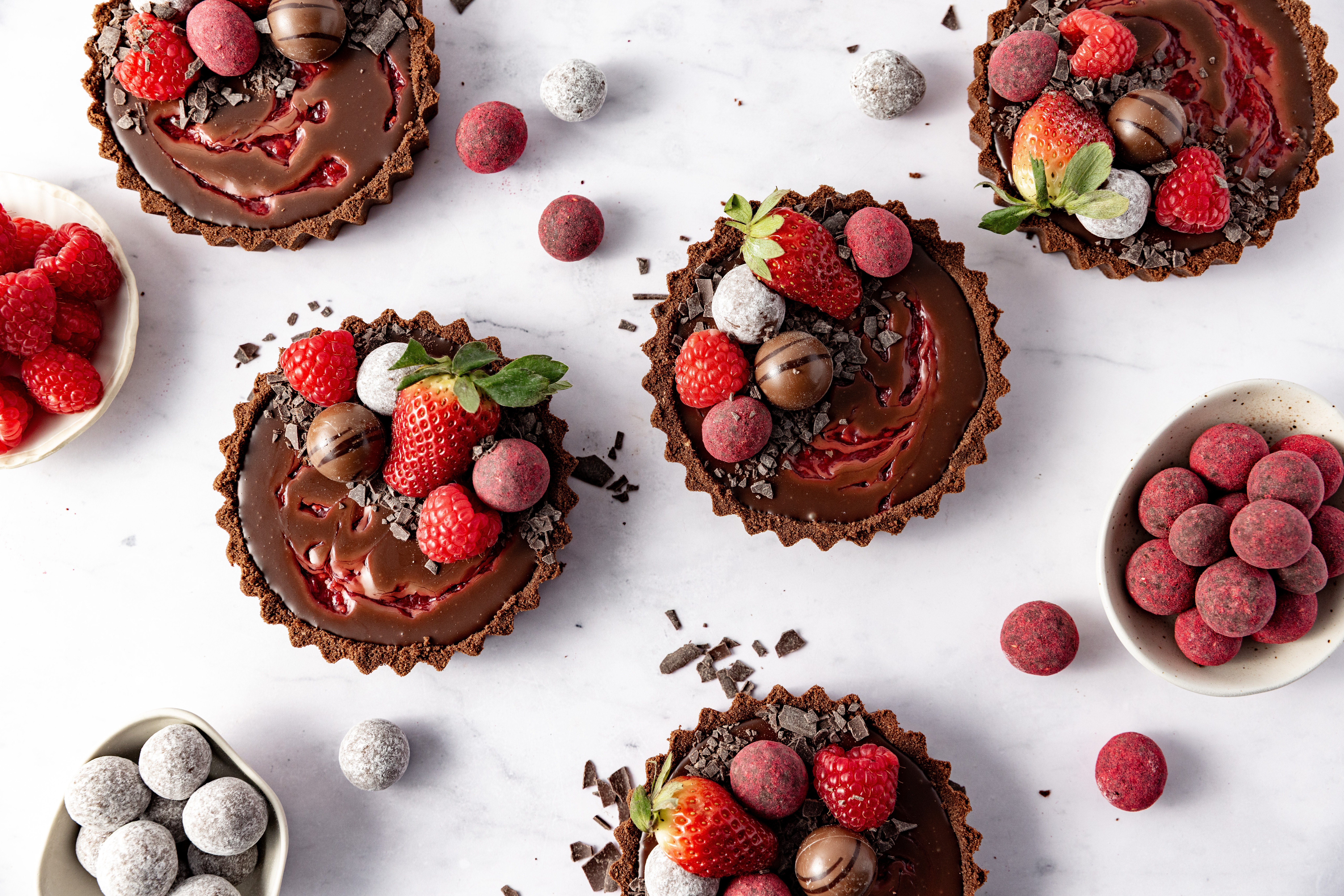 - Remove the pan bases and sprinkle tarts with Koko Black Chocolate Shavings, top with extra Koko Black chocolates and fresh berries, and serve with double cream, any remaining berry coulis if you wish.