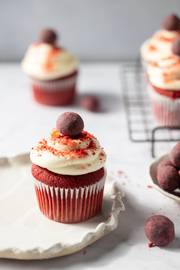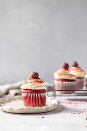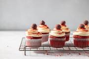 Place cupcake liners in a 12-hole muffin pan. Sift flour, cocoa and baking powder into a bowl and whisk to combine. In a separate bowl, beat butter and sugar with electric mixer until fluffy and pale. Add egg and beat until combined. Add vanilla, buttermilk, vinegar, and food colouring and beat to combine. Add dry ingredients and beat until combined.
