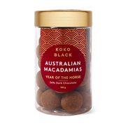 54% Dark Chocolate Roasted Macadamias in Year of the Horse packaging.