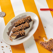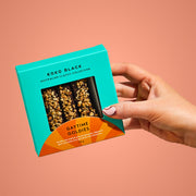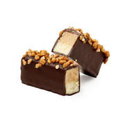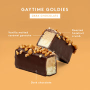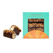 An oldie and a goldie. A super silky duo of vanilla and malted caramel ganache dipped in dark chocolate and sprinkled with caramelised hazelnuts. This one’s a crumbly, chewy and scrumptious adventure of milky malt memories, sunny afternoons and ice-creams that melt too quickly.